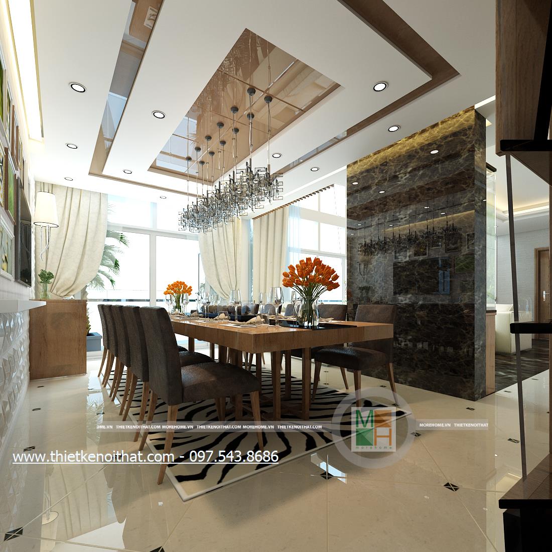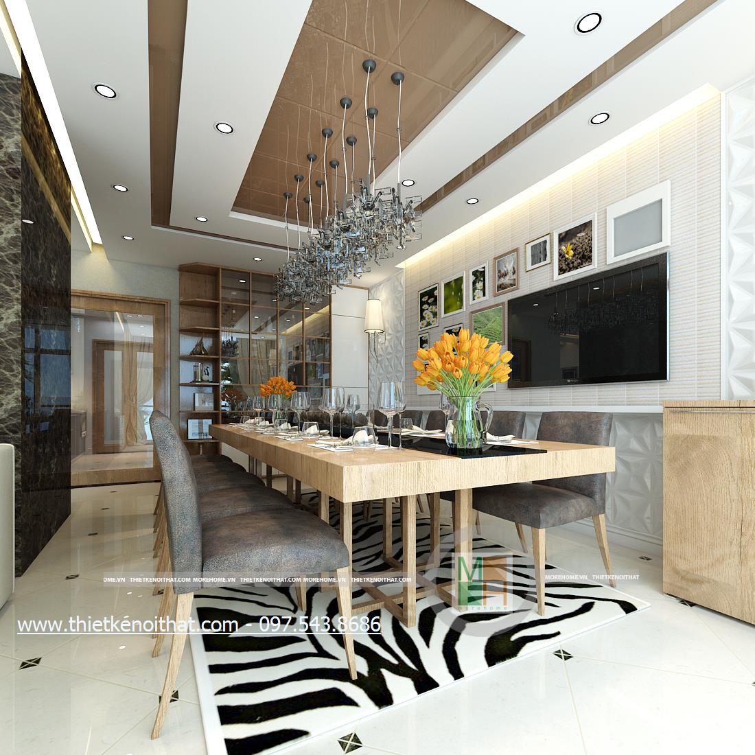 Thiết kế nội thất phòng ăn hiện đại với bàn ăn rộng phù hợp với nhiều hoàn cảnh, khá linh hoạt và tiện dụng. Với phong cách thiết kế đơn giản, không quá cầu kỳ về kiểu cách nhưng thiết kế bàn ăn lại mang đến cảm giác tinh tế và đồng điệu cho không gian sinh hoạt chung. Thiết kế tường đơn sắc được thay bằng giấy dán tường với hoa văn chìm để tránh cảm giác đơn điệu, lặp đi lặp lại mà vẫn giữ được nét hiện địa và tối giản trong thiết kế. Đèn chùm đơn thuần được thay thế bằng thiết kế đèn cách tân lạ mắt tạo điểm nhấn sáng tạo cho căn phòng.