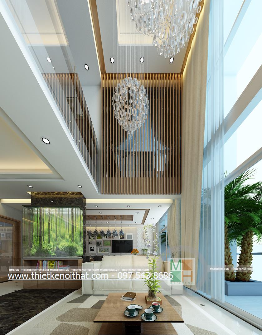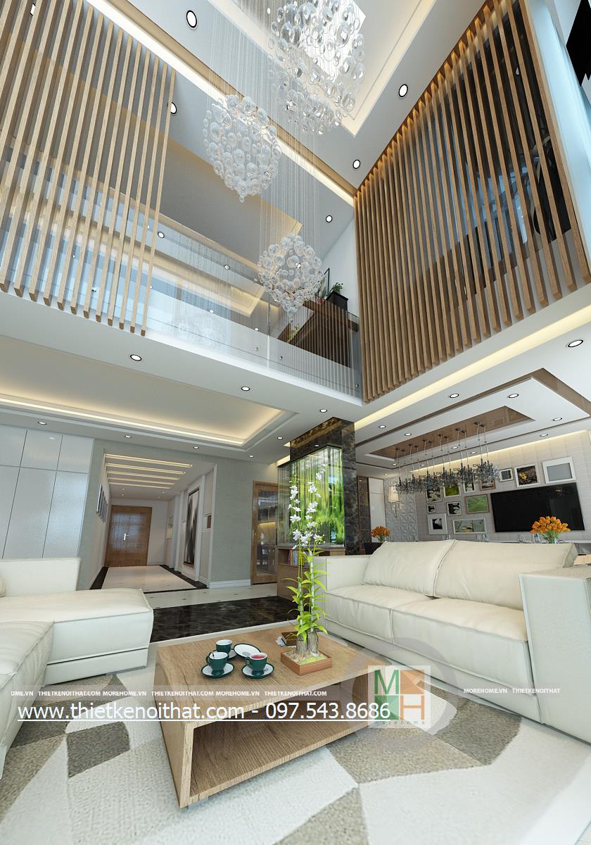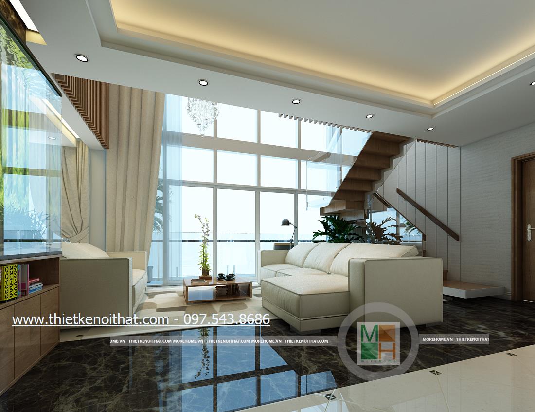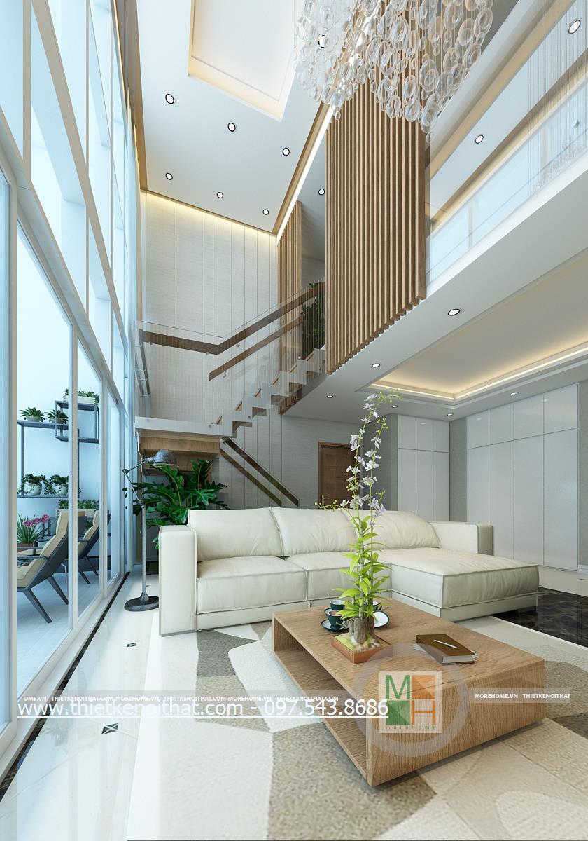 Thiết kế nội thất phòng khách hiện đại cho căn nhà Penthouse sử dụng tông màu trắng và nâu làm hai màu chủ đạo mang đến một vẻ đẹp nhẹ nhàng mà tinh tế cho không gian. Một trong những điểm lợi thế của chung cư cao cấp Penthouse đó chính là chiều cao. Với chiều cao khá lớn, sẽ giúp kiến trúc sư tận dụng được mặt chiếu sáng từ đó mang ánh sáng tự nhiên tràn vào căn nhà. Tuy nhiên với thiết kế trần khá cao nên việc trang trí trần nhà thường khó gây được ấn tượng, dễ gây cảm giác trống rỗng và đơn điệu cho trần nhà. Để tránh cảm giác thiếu an toàn đó và khắc phục được nhược điểm này, kiến trúc sư đã khéo léo sử dụng thiết kế đèn chùm kéo dài kết hợp với ánh sáng âm trần để mang đến sự hài hòa về ánh sáng và cân bằng về chiều cao cho căn phòng. Bên cạnh đó, các thiết kế thanh dọc màu veneer nâu sáng xếp dọc hành lang tạo điểm nhấn thẩm mỹ cho căn nhà.