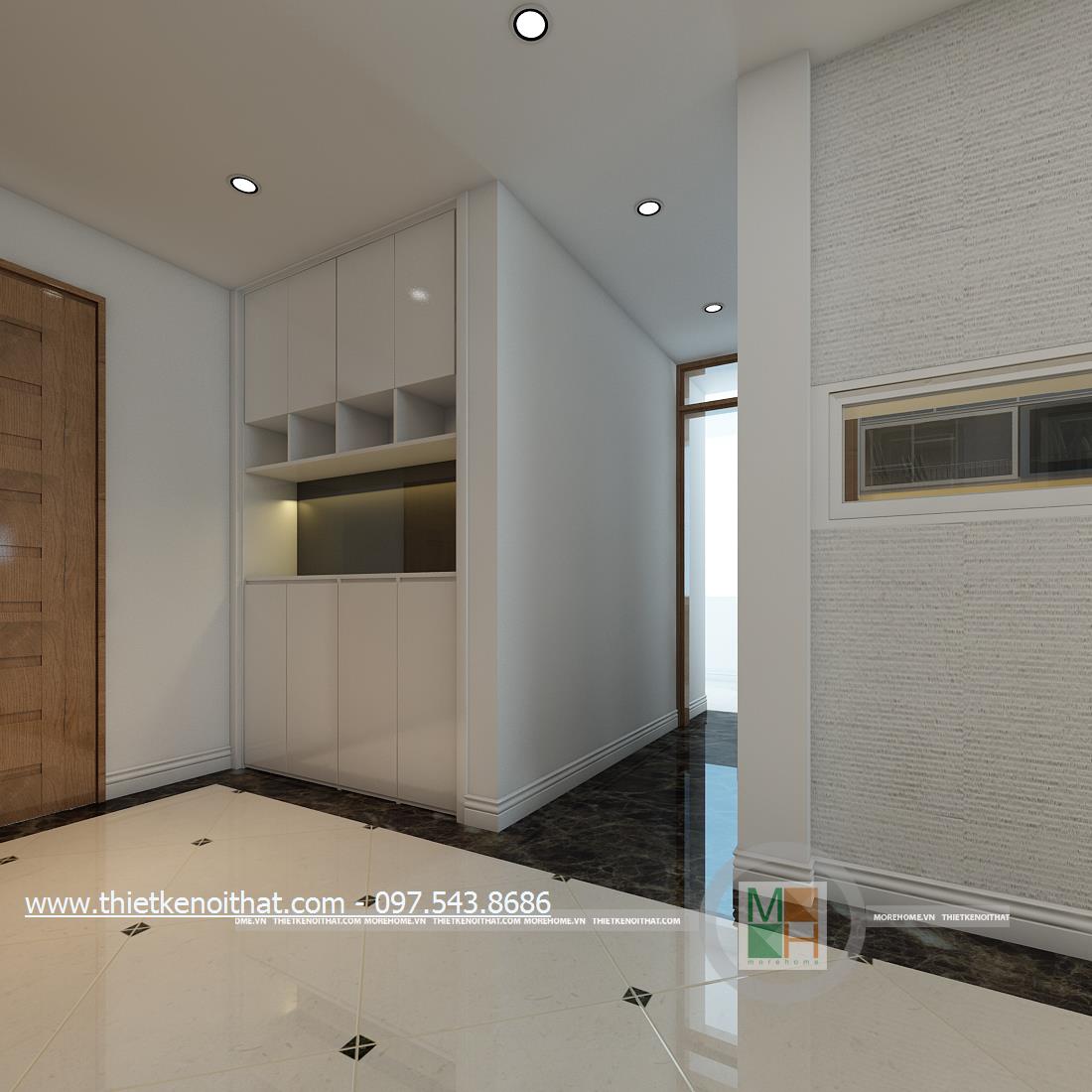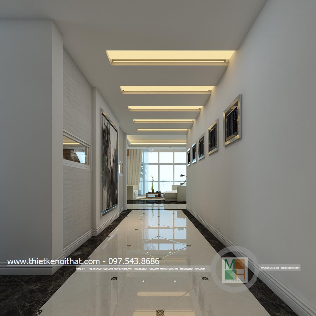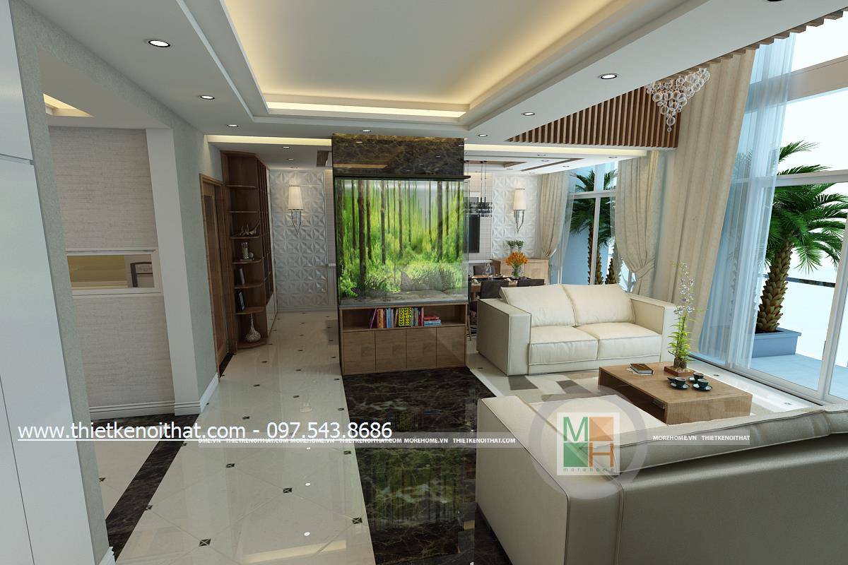 Thiết kế nội thất phòng khách hiện đại cho căn nhà Penthouse sử dụng tông màu trắng và nâu làm hai màu chủ đạo mang đến một vẻ đẹp nhẹ nhàng mà tinh tế cho không gian. Một trong những điểm lợi thế của chung cư cao cấp Penthouse đó chính là chiều cao. Với chiều cao khá lớn, sẽ giúp kiến trúc sư tận dụng được mặt chiếu sáng từ đó mang ánh sáng tự nhiên tràn vào căn nhà. Tuy nhiên với thiết kế trần khá cao nên việc trang trí trần nhà thường khó gây được ấn tượng, dễ gây cảm giác trống rỗng và đơn điệu cho trần nhà. Để tránh cảm giác thiếu an toàn đó và khắc phục được nhược điểm này, kiến trúc sư đã khéo léo sử dụng thiết kế đèn chùm kéo dài kết hợp với ánh sáng âm trần để mang đến sự hài hòa về ánh sáng và cân bằng về chiều cao cho căn phòng. Bên cạnh đó, các thiết kế thanh dọc màu veneer nâu sáng xếp dọc hành lang tạo điểm nhấn thẩm mỹ cho căn nhà.