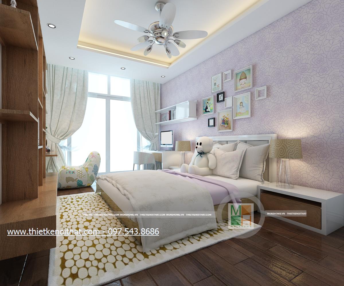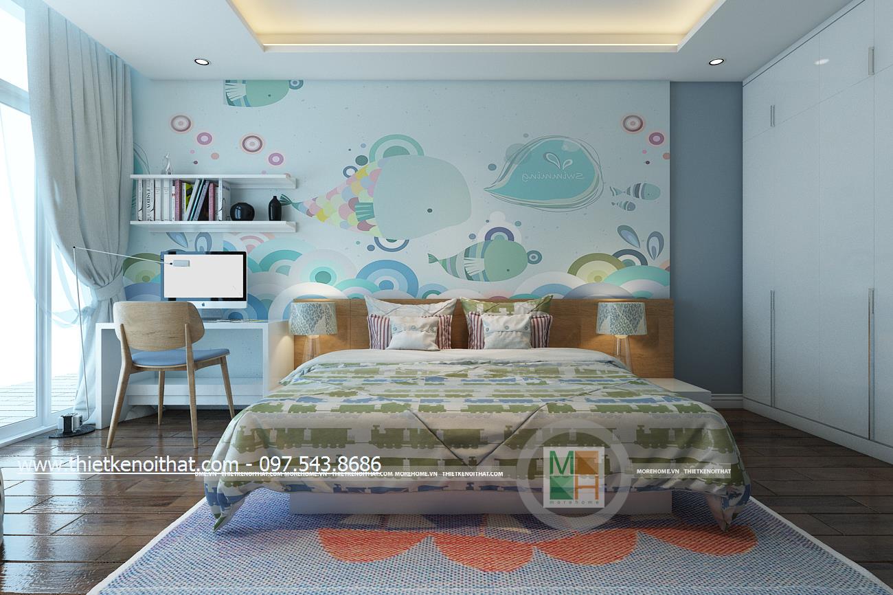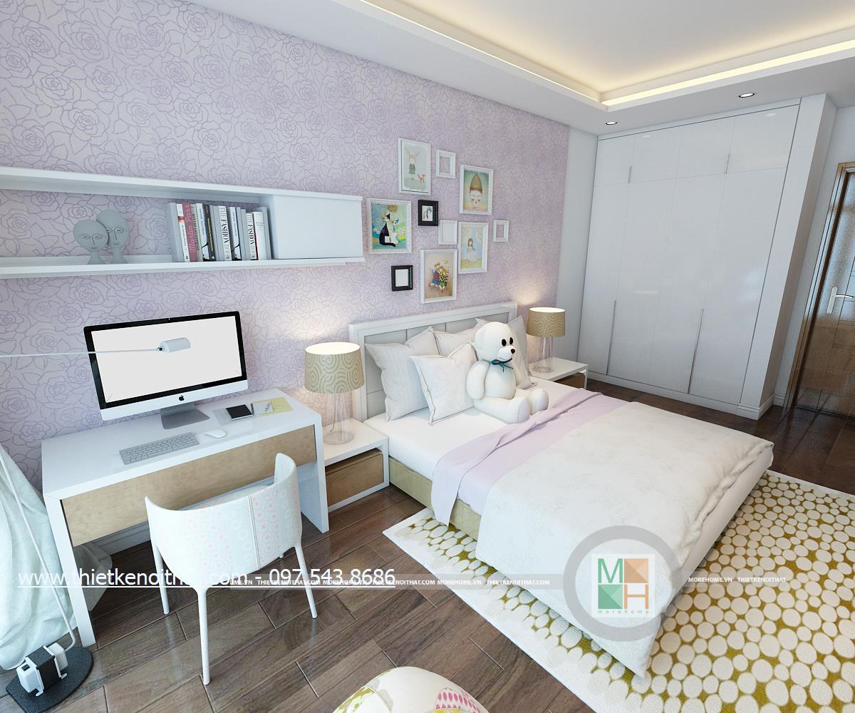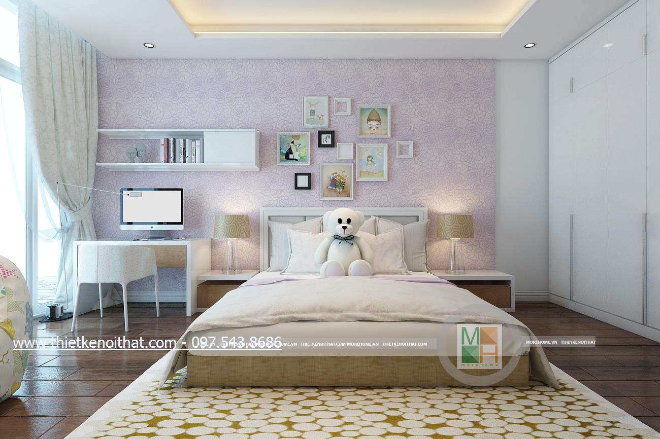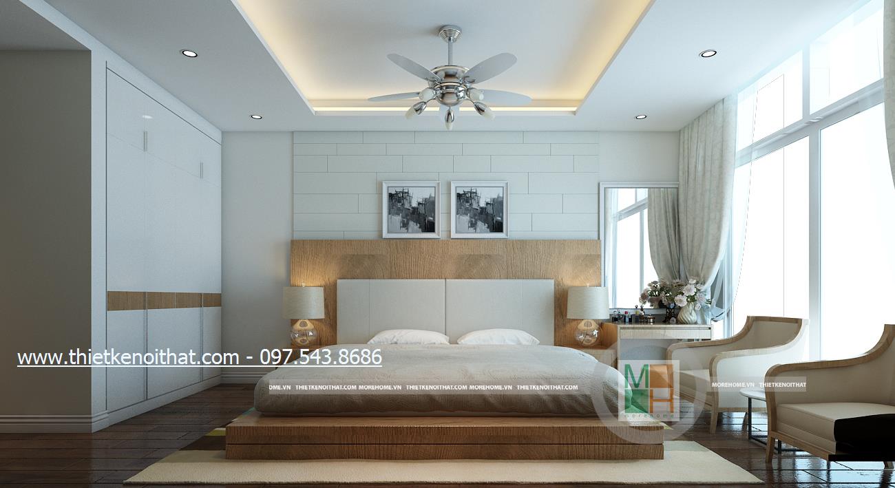 Thiết kế nội thất phòng ngủ sử dụng tông màu sáng làm chủ đạo mang đến vẻ đẹp trang nhã và thân thuộc. Ánh sáng tự nhiên được kiến trúc sư sử dụng làm bừng sáng căn phòng. Với việc sử dụng giấy dán tường 3D, kiến trúc sư đã khéo léo thay đổi và mang lại điểm nhấn thẩm mỹ cho căn phòng.