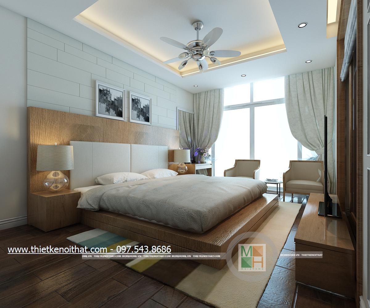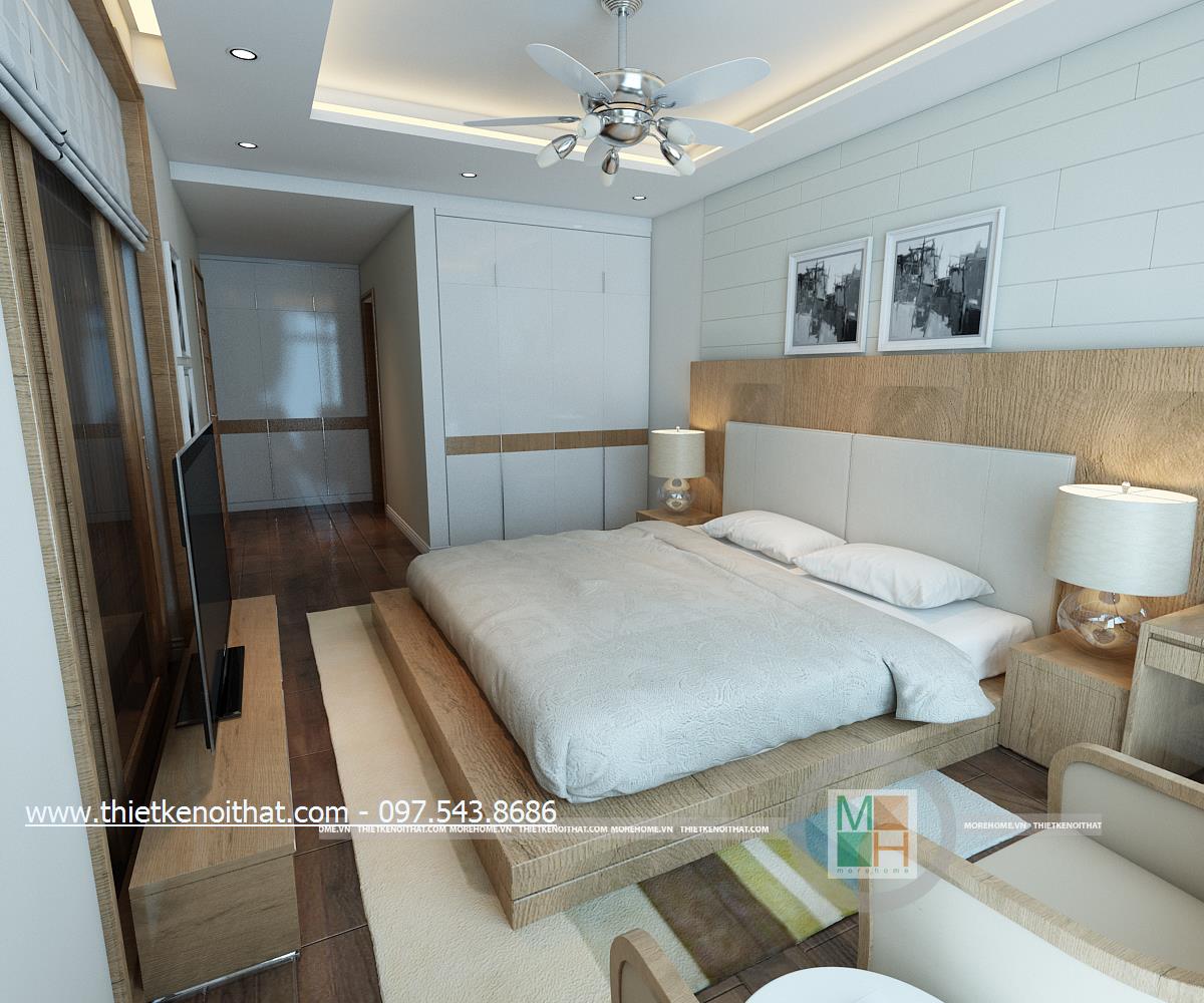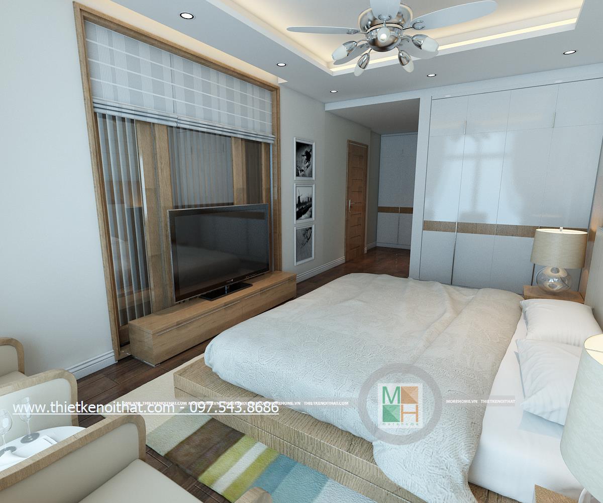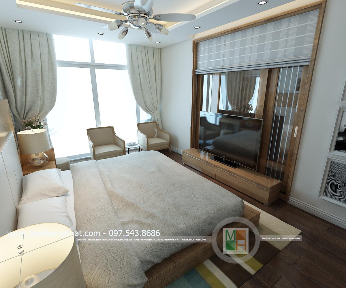 Thiết kế nội thất phòng ngủ sử dụng tông màu sáng làm chủ đạo mang đến vẻ đẹp trang nhã và thân thuộc. Ánh sáng tự nhiên được kiến trúc sư sử dụng làm bừng sáng căn phòng. Với việc sử dụng giấy dán tường 3D, kiến trúc sư đã khéo léo thay đổi và mang lại điểm nhấn thẩm mỹ cho căn phòng.