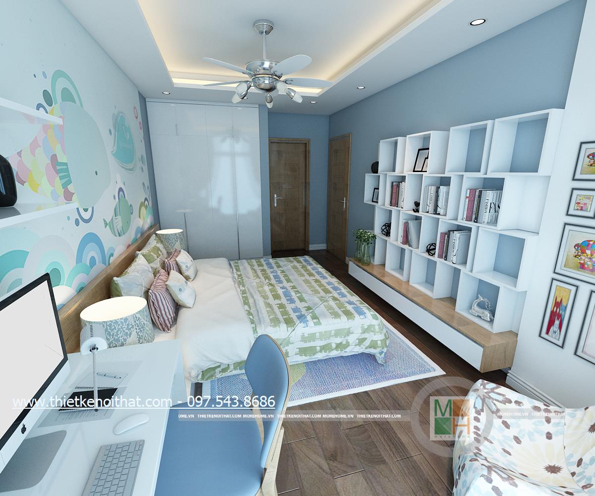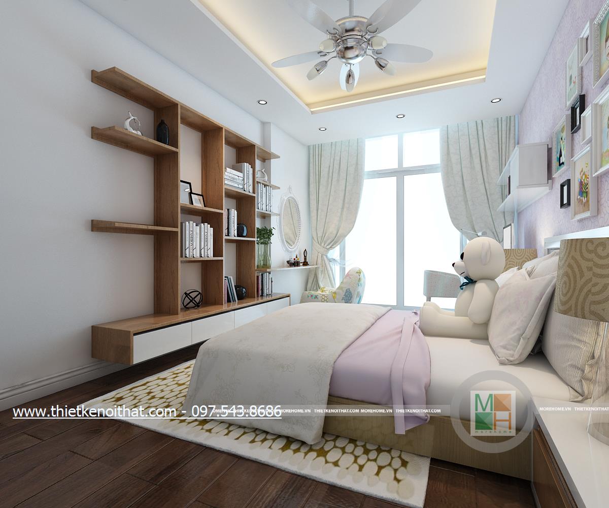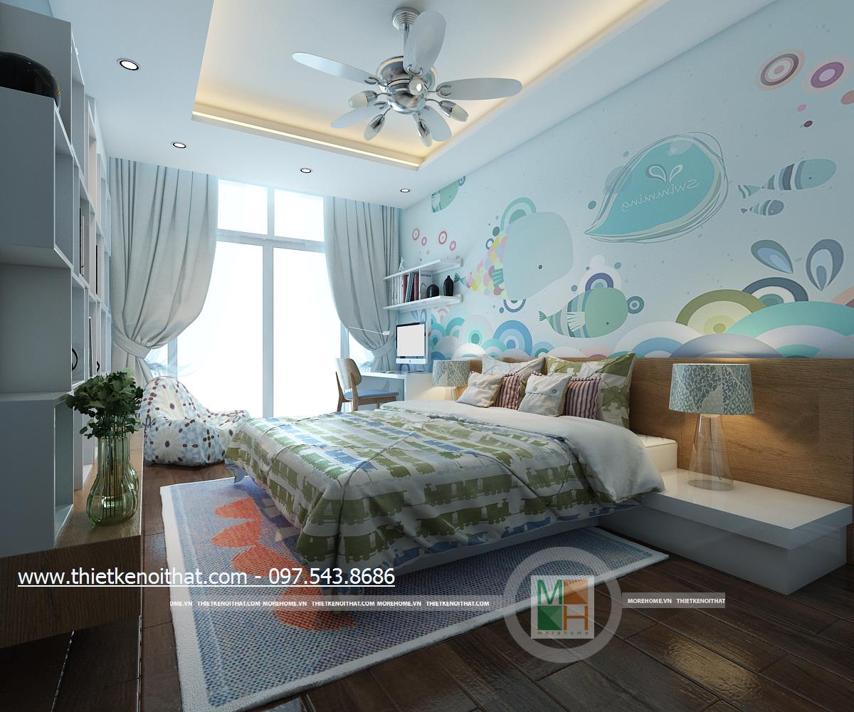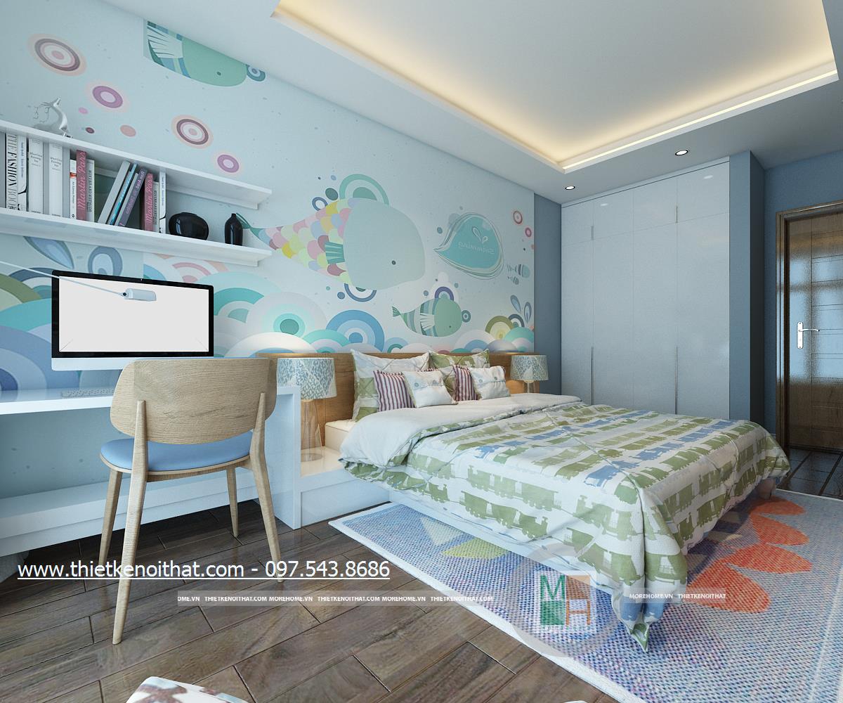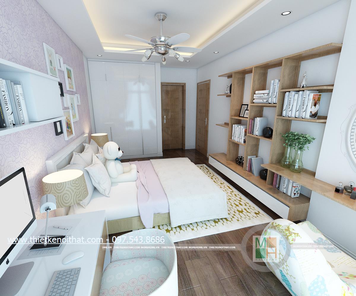 Thiết kế nội thất phòng ngủ sử dụng tông màu sáng làm chủ đạo mang đến vẻ đẹp trang nhã và thân thuộc. Ánh sáng tự nhiên được kiến trúc sư sử dụng làm bừng sáng căn phòng. Với việc sử dụng giấy dán tường 3D, kiến trúc sư đã khéo léo thay đổi và mang lại điểm nhấn thẩm mỹ cho căn phòng.