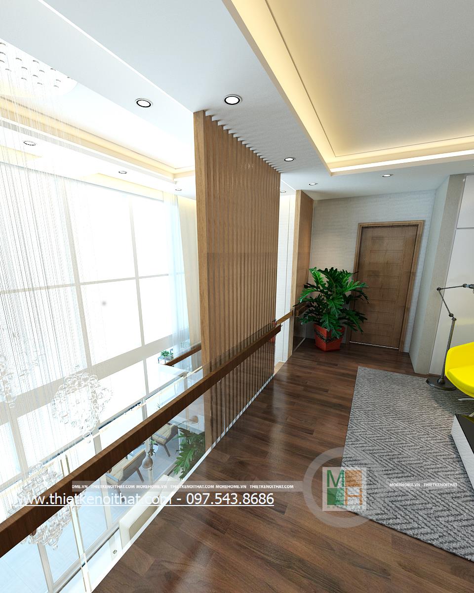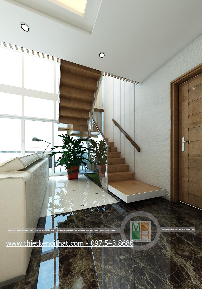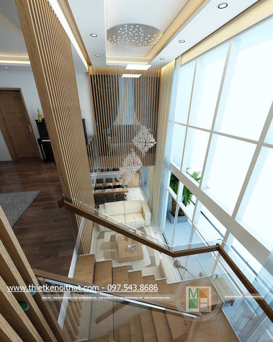 Thiết kế cầu thang hiện đại sử dụng hai vật liệu nhẹ là kính và gỗ làm nguyên liệu chủ đạo để tránh cảm giác bí bách mà các kết cấu gạch thô built-in đem lại. Màu sắc vẫn là nâu sữa sáng và trắng làm chủ đạo vì vậy mang đến cảm giác thiết kế đồng nhất, định hình phong cách thiết kế hiện đại. Kết cấu cầu thang được kiến trúc sư chia thành hai nhịp với không gian nghỉ rõ ràng tạo thế an toàn cho các gia đình có thẻ nhỏ. Với thiết kế kính trong suốt nên cầu thang được đánh giá cao về độ thẩm mỹ.