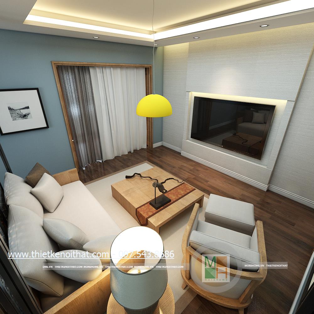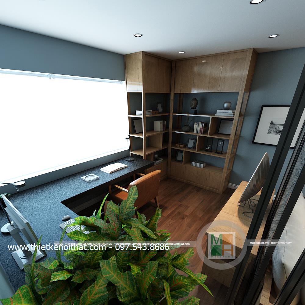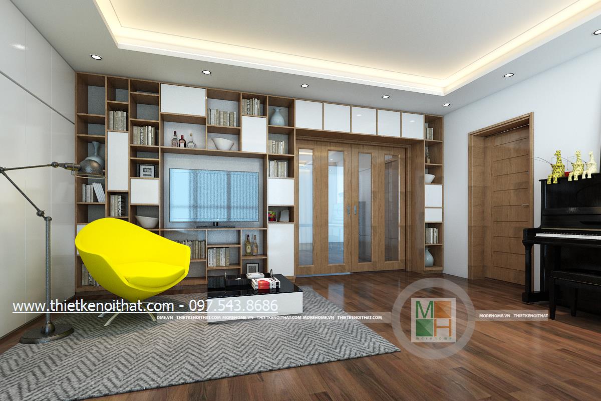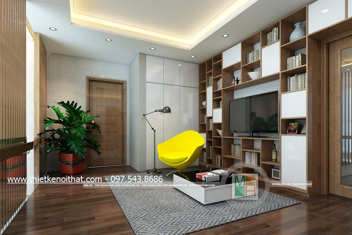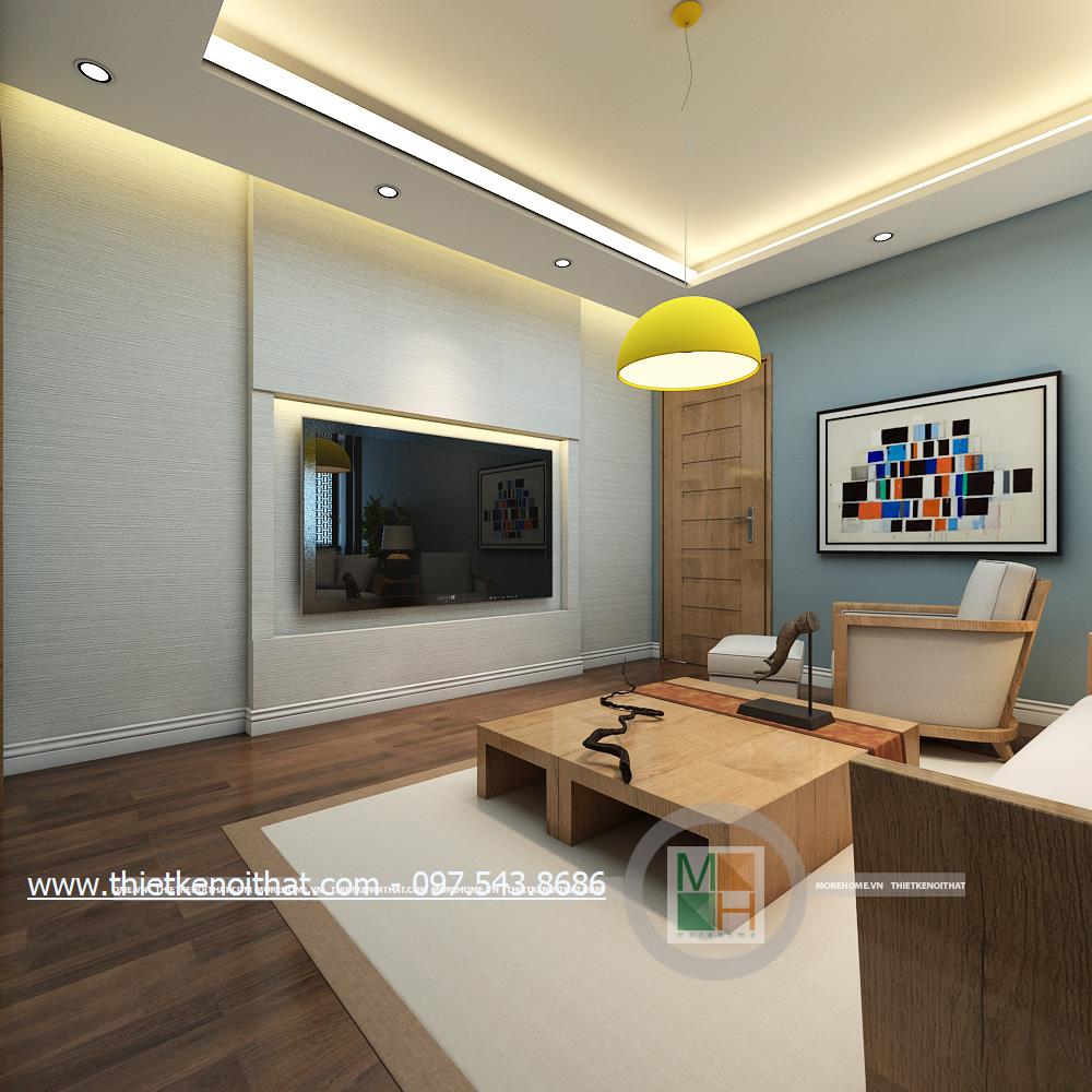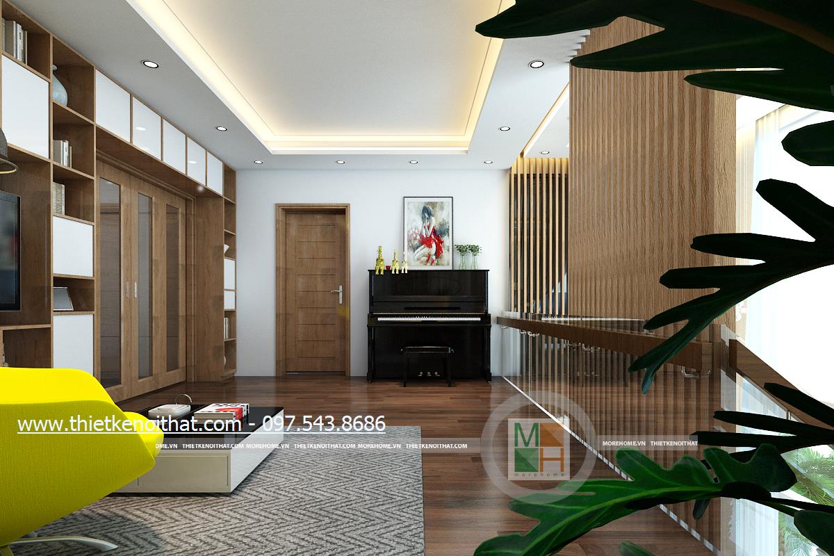 Một trong những không gian được gia chủ tâm đắc chính là thiết kế khu sinh hoạt chung trên tầng hai. Hành lang tầng hai được tận dụng làm khu sinh hoạt chung. Khác với thiết kế phòng khách, khu sinh hoạt chung là nơi dành riêng cho cả gia đình, không dành để tiếp khách vì vậy mà khá riêng tư và tách biệt. Thiết kế tủ gỗ được kết hợp với kệ ti vi và được đặt đồng nhất với tường mang đến một sự kết hợp lạ mắt và tinh tế, giúp đảm bảo tính thẩm mỹ và làm tăng tính công năng cho sản phẩm. Không gian không quá cầu kỳ, chủ yếu kiến trúc sư muốn dành diện tích cho các hoạt động chơi đùa của các thành viên vì vậy thiết kế tối giản, tiết kiệm không gian đa năng được ưu tiên hơn. Ánh sáng âm trần và ánh sáng tự nhiên kết hợp hài hòa mang đến một không gian tràn đấy sức sống cho gia chủ.