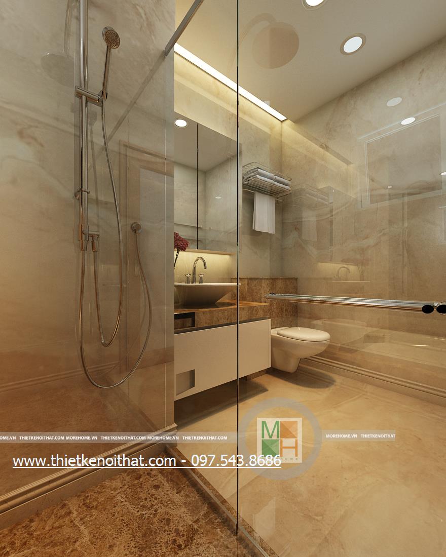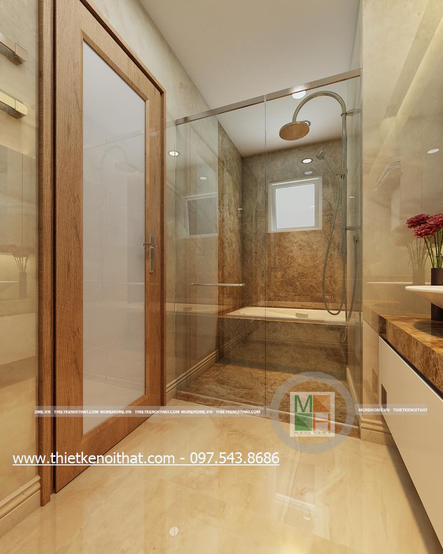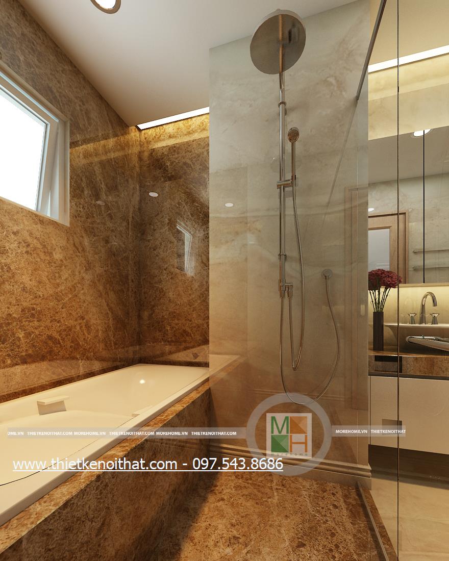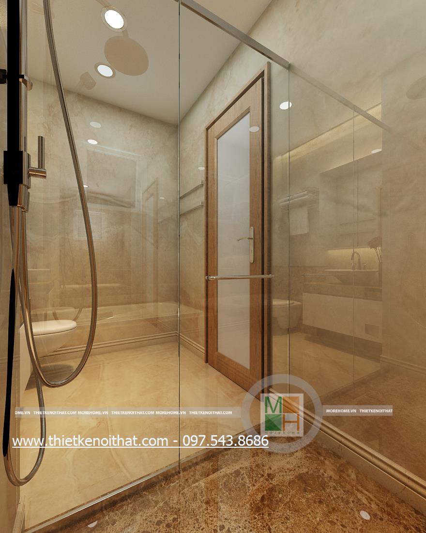 Cuối cùng là thiết kế nội thất phòng tắm hiện đại. Kính cường lực và đá tự nhiên được sử dụng làm vật liệu chủ yếu mang lại cảm giác tự nhiên và thoải mái cho gia chủ. Không gian thiết kế trẻ trung với không gian rộng và sáng. Bên cạnh đó, kính cường lực và đá có độ phản chiếu nhẹ nhàng giúp mang lại cảm giác cơi nới không gian.