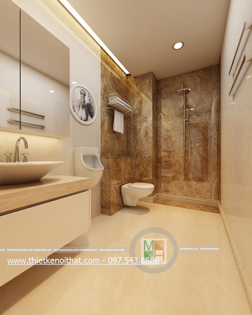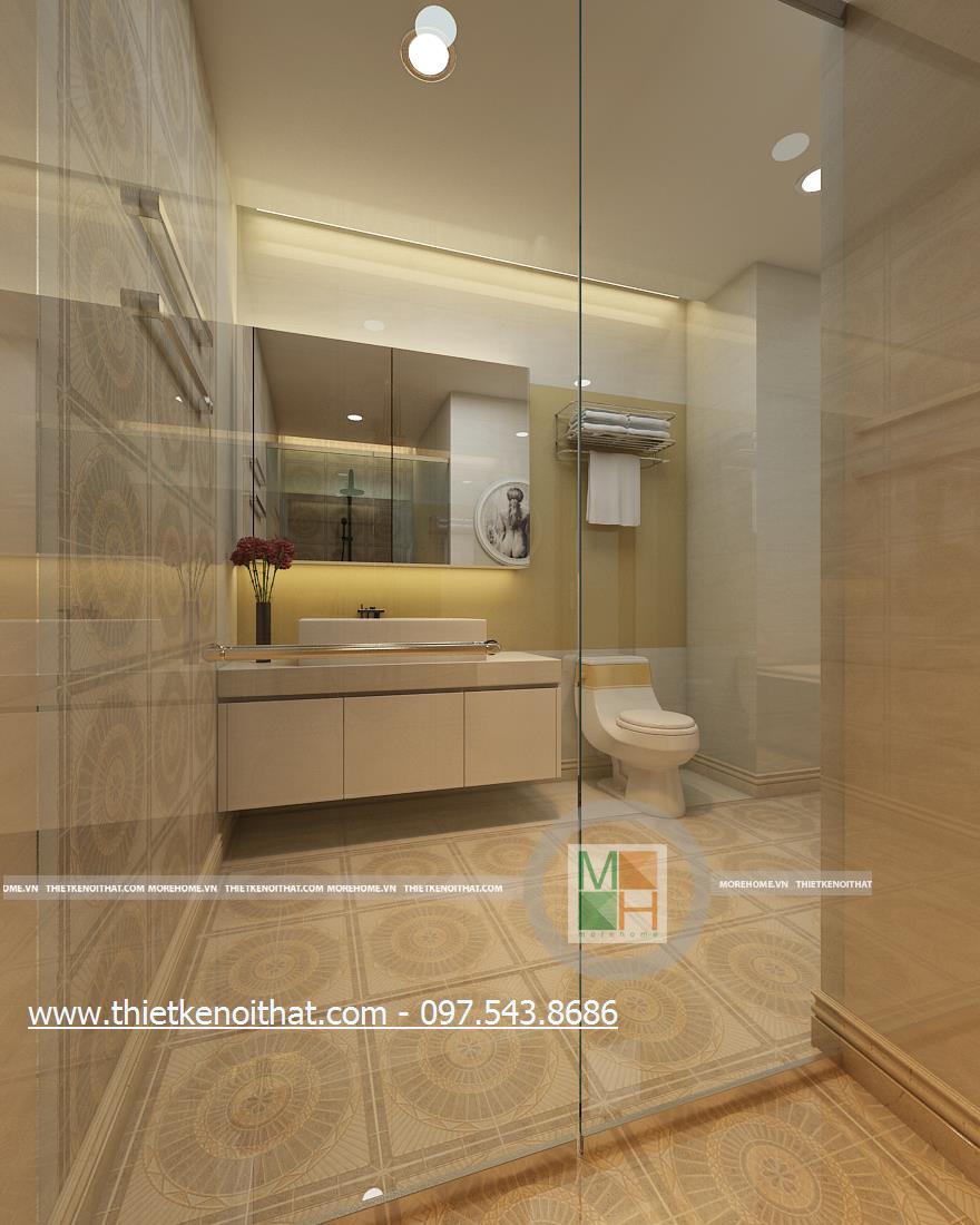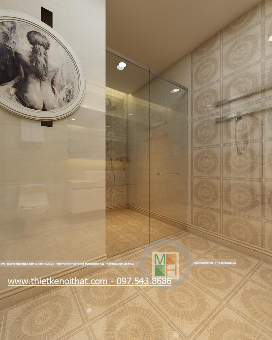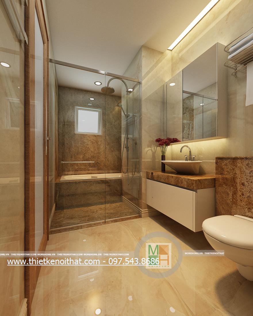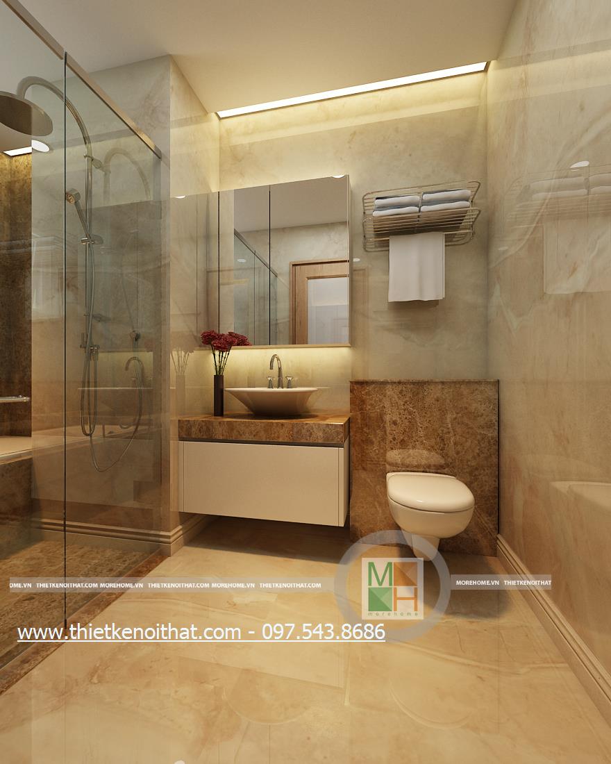 Cuối cùng là thiết kế nội thất phòng tắm hiện đại. Kính cường lực và đá tự nhiên được sử dụng làm vật liệu chủ yếu mang lại cảm giác tự nhiên và thoải mái cho gia chủ. Không gian thiết kế trẻ trung với không gian rộng và sáng. Bên cạnh đó, kính cường lực và đá có độ phản chiếu nhẹ nhàng giúp mang lại cảm giác cơi nới không gian.