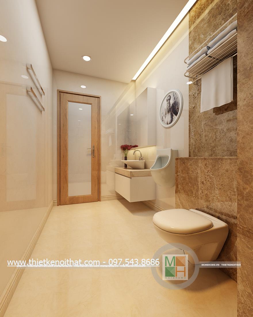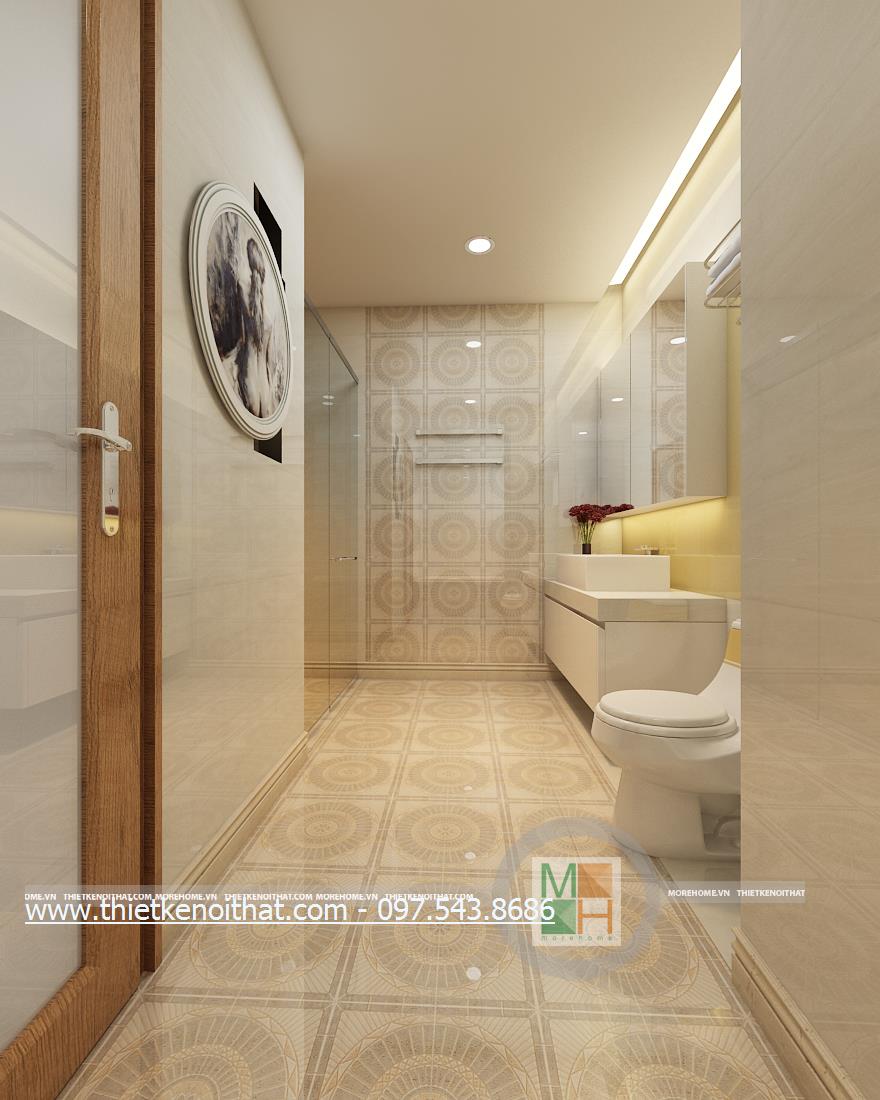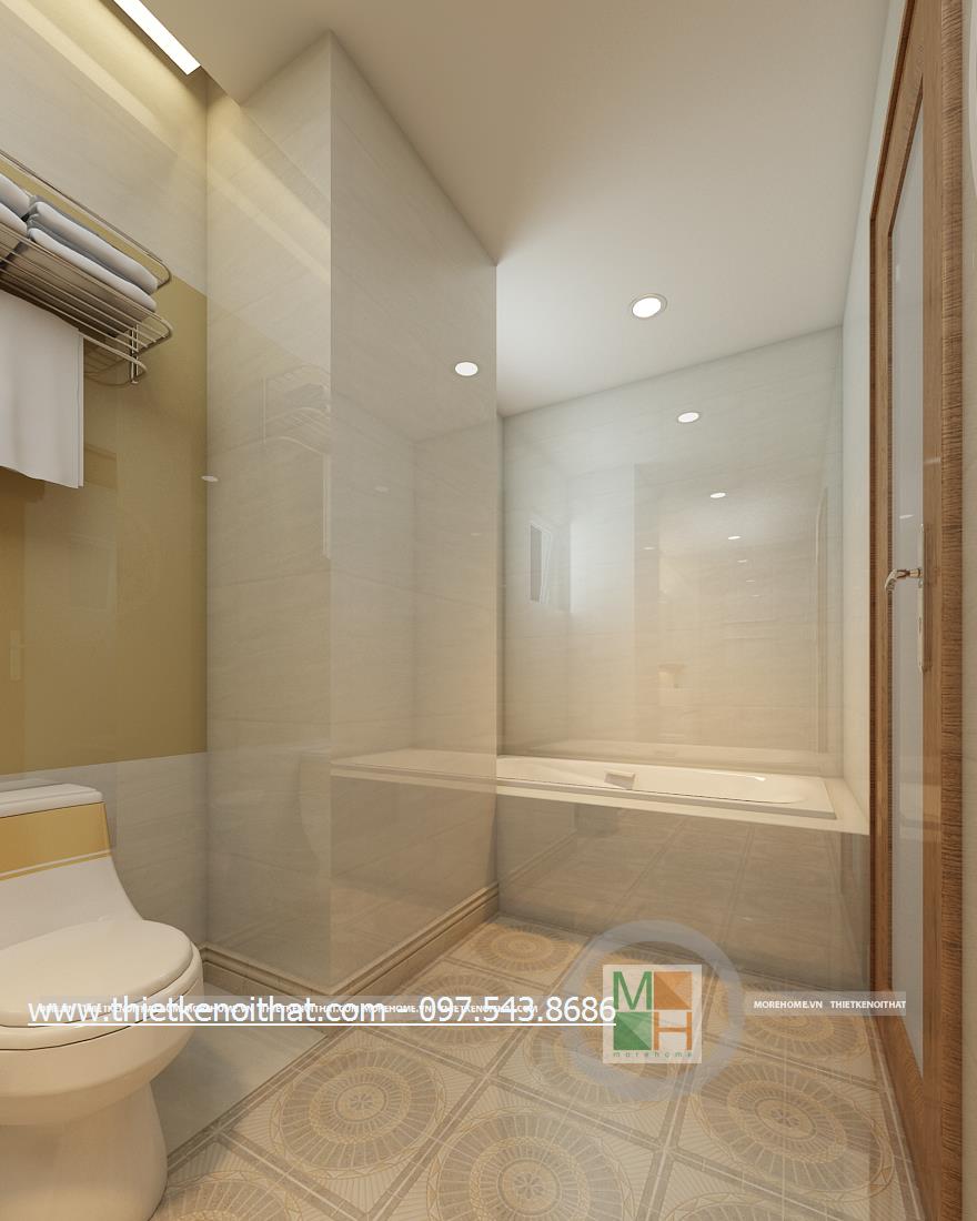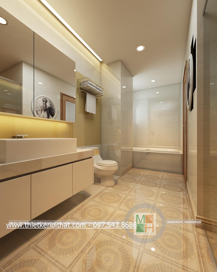Cuối cùng là thiết kế nội thất phòng tắm hiện đại. Kính cường lực và đá tự nhiên được sử dụng làm vật liệu chủ yếu mang lại cảm giác tự nhiên và thoải mái cho gia chủ. Không gian thiết kế trẻ trung với không gian rộng và sáng. Bên cạnh đó, kính cường lực và đá có độ phản chiếu nhẹ nhàng giúp mang lại cảm giác cơi nới không gian.