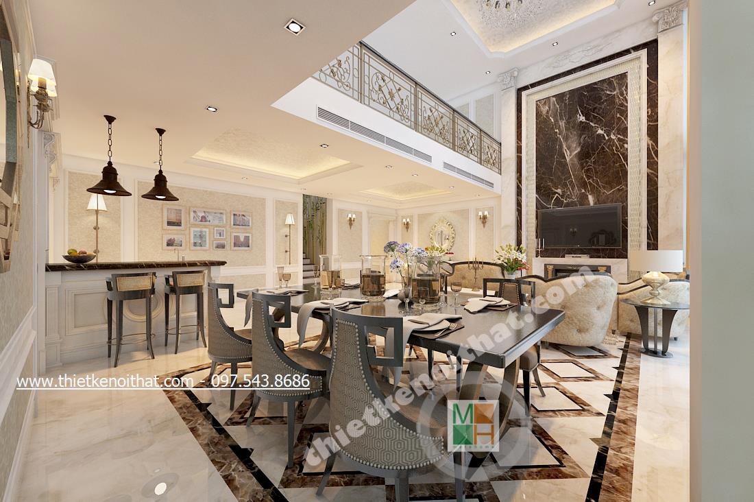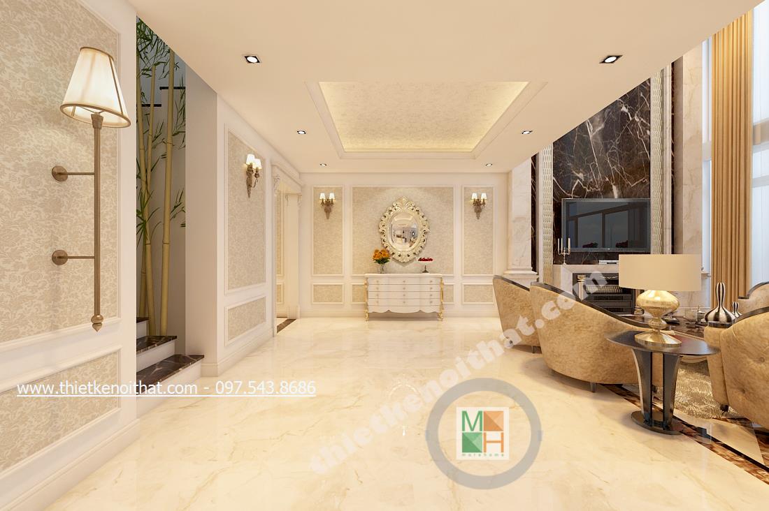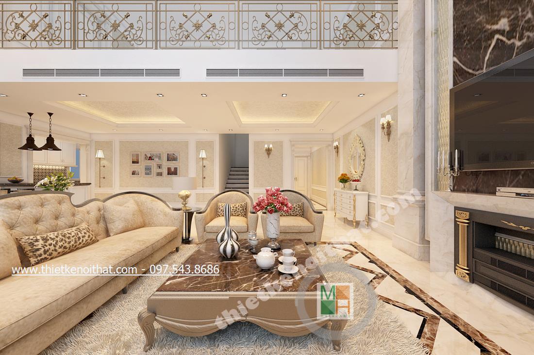 Đồng thời đặt chiếc thảm lông ở phòng khách cũng càng làm tăng thêm sự sang trọng cho căn nhà. Thảm lông được lựa chọn màu xám rất hợp với chi tiết đá hoa cương ở dưới sàn. Nhân đây nói về lựa chọn sàn đá hoa cương là một trong những đặc trưng bóng bẩy của thiết kế tân cổ điển giúp căn nhà mang đậm nét sang trọng hơn. Sofa cũng sử dụng các chi tiết cầu kỳ với các đường nét uốn lượn đặc trưng của vương giả.