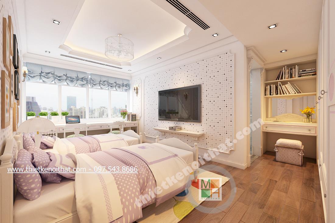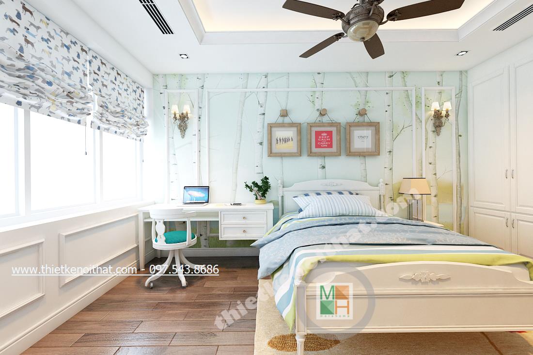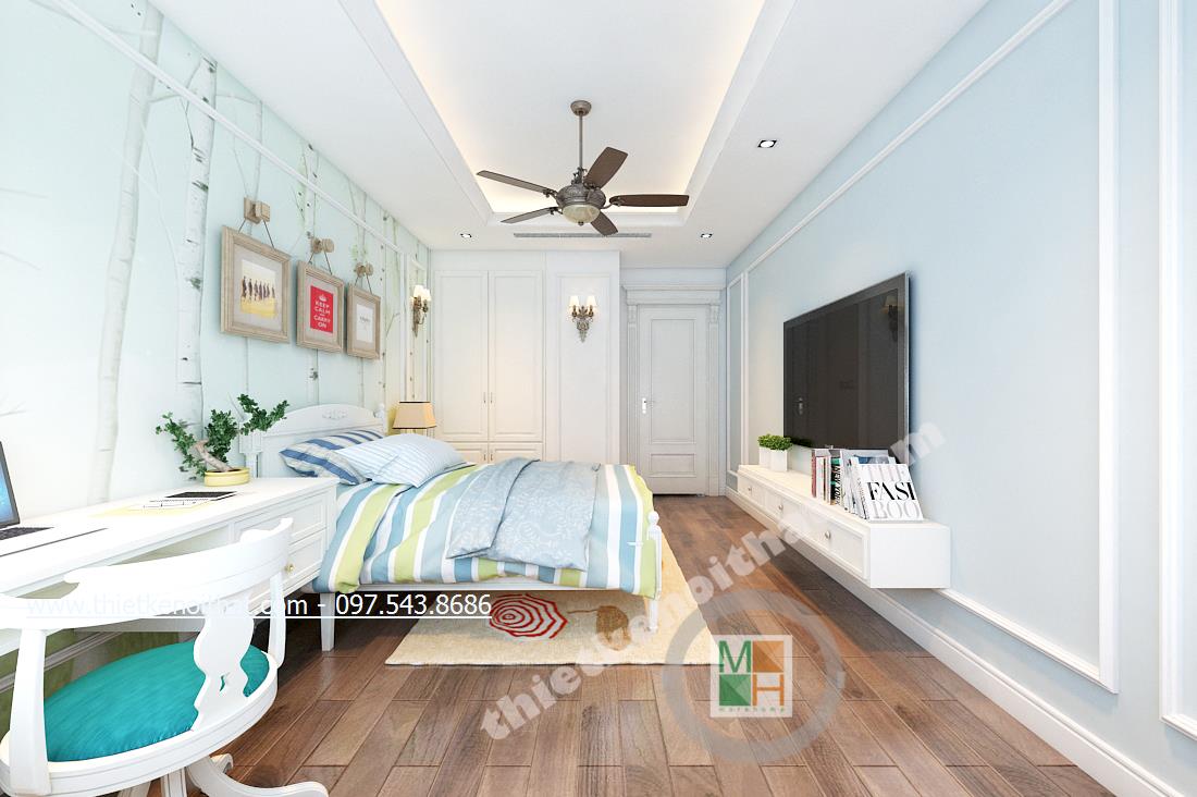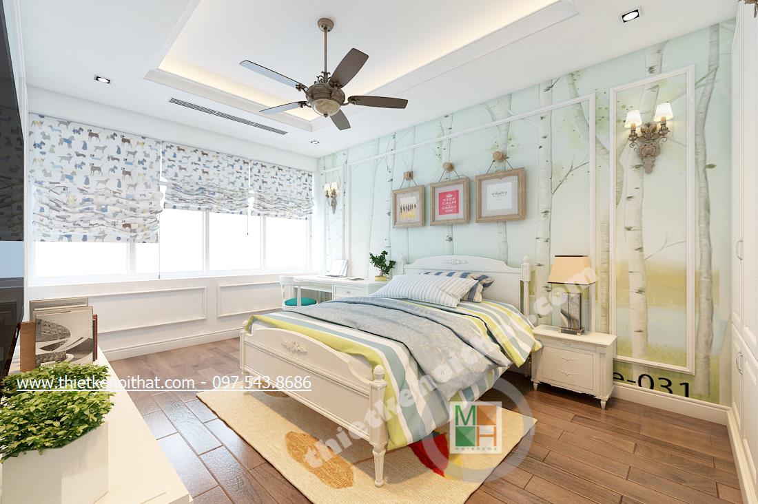 Thiết kế nội thất phòng ngủ tiếp theo mang đến nhiều cảm giác cuả thiên nhiên hơn và ngả nhiều về phía hiện đại của thiết kế theo phong cách tân cổ điển. Điều này thể hiện ở bức tường in ảnh thiên nhiên đằng sau cùng màu sắc của bộ ga giường và chậu cây khéo léo đặt cạnh TV. Tổng thể căn phòng giúp gợi cho người nhìn và chủ nhân căn phòng cảm giác nhẹ nhàng như bước vào một căn phòng nhỏ với chiếc rèm xinh xinh trong những bộ phim của Studio Ghibli.