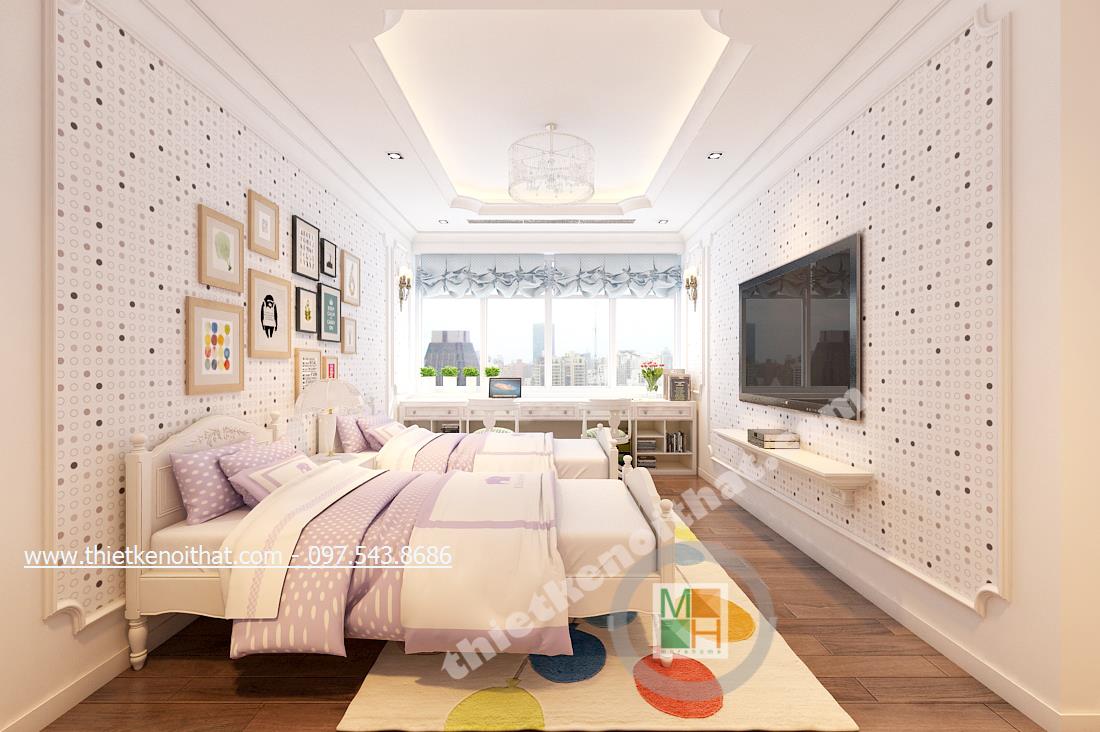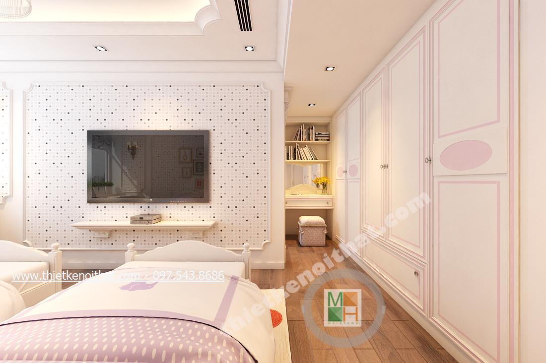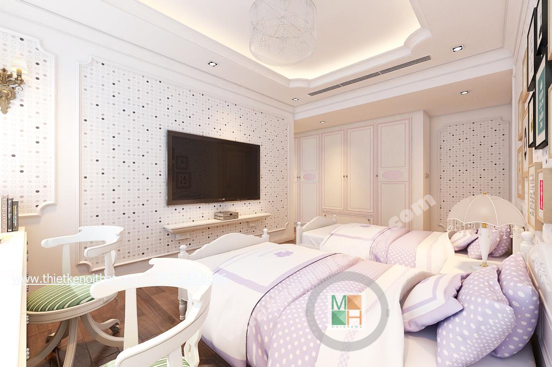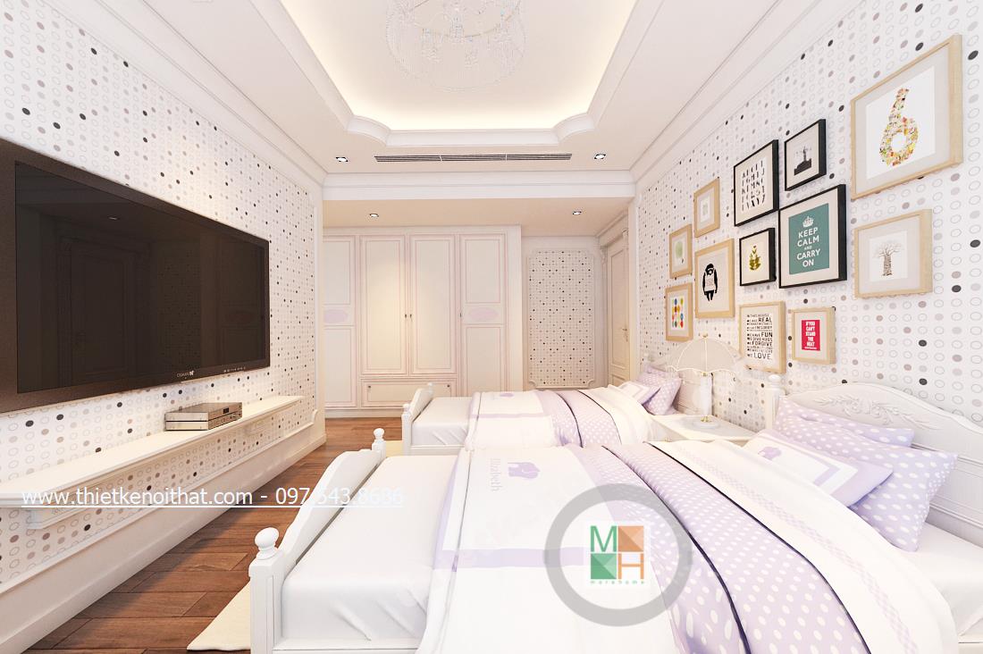 Thiết kế nội thất phòng ngủ tiếp theo mang đến nhiều cảm giác cuả thiên nhiên hơn và ngả nhiều về phía hiện đại của thiết kế theo phong cách tân cổ điển. Điều này thể hiện ở bức tường in ảnh thiên nhiên đằng sau cùng màu sắc của bộ ga giường và chậu cây khéo léo đặt cạnh TV. Tổng thể căn phòng giúp gợi cho người nhìn và chủ nhân căn phòng cảm giác nhẹ nhàng như bước vào một căn phòng nhỏ với chiếc rèm xinh xinh trong những bộ phim của Studio Ghibli.