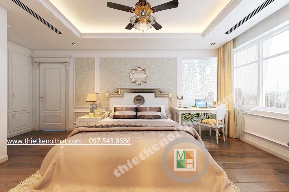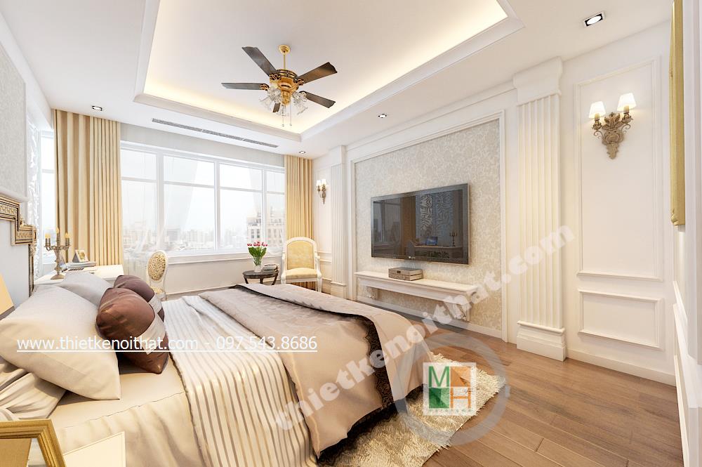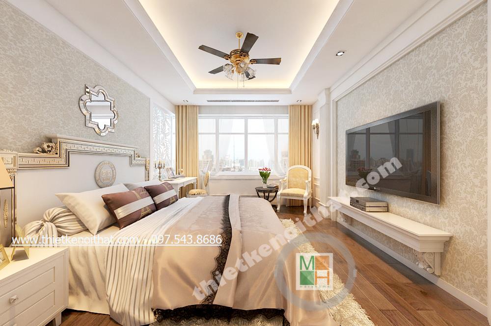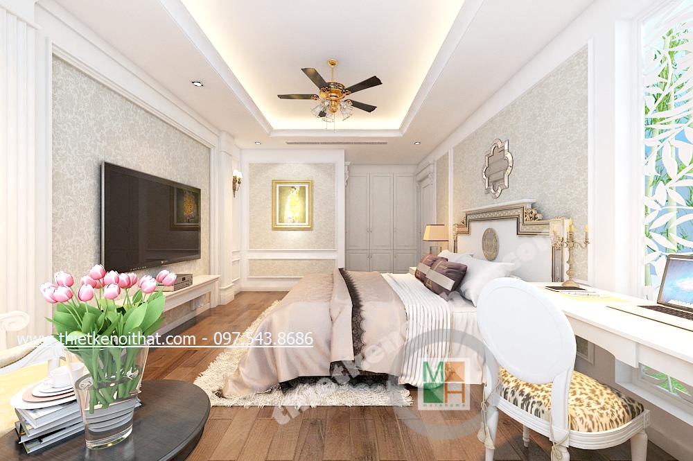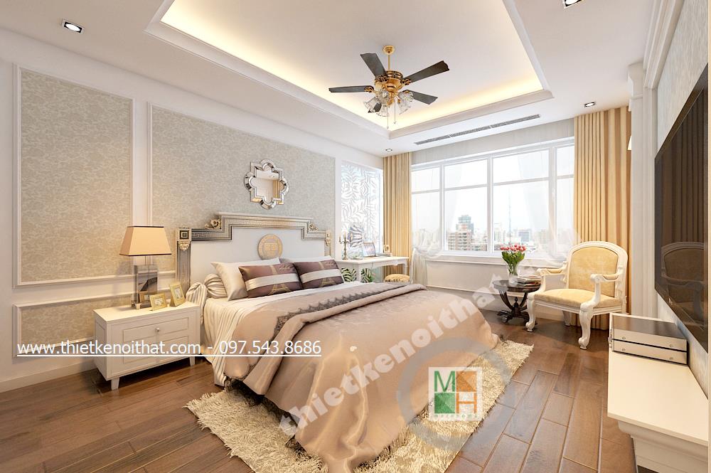 Thiết kế nội thất phòng ngủ Master của gia chủ lại lựa chọn tone màu sáng và gold nhẹ vừa có sự liên kết với thiết kế tân cổ điển chung của cả căn nhà mà vẫn tạo cảm giác nhẹ nhàng, thư thái. Ở đây chiếc thảm giả lông được lồng khéo léo dưới chân giường cầu kỳ giúp mang đến cảm giác đế vương. Các chi tiết khác như đèn giả quạt và gương trên đầu giường đều là sự kết hợp hài hòa và thanh lịch giữa thiết kế nội thất tân cổ điển và thiết kế nội thất phong cách hiện đại.