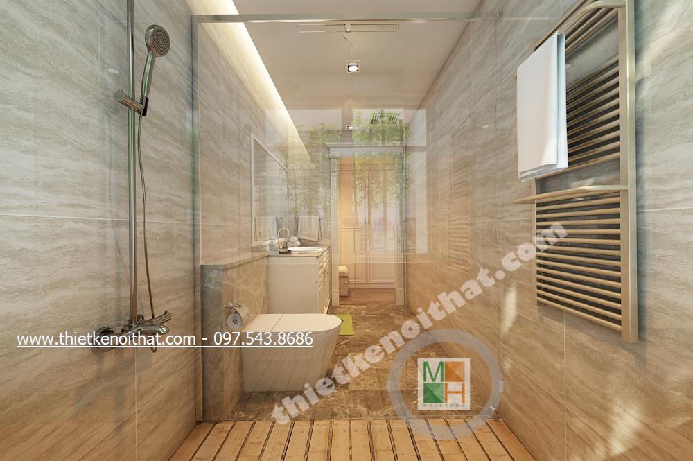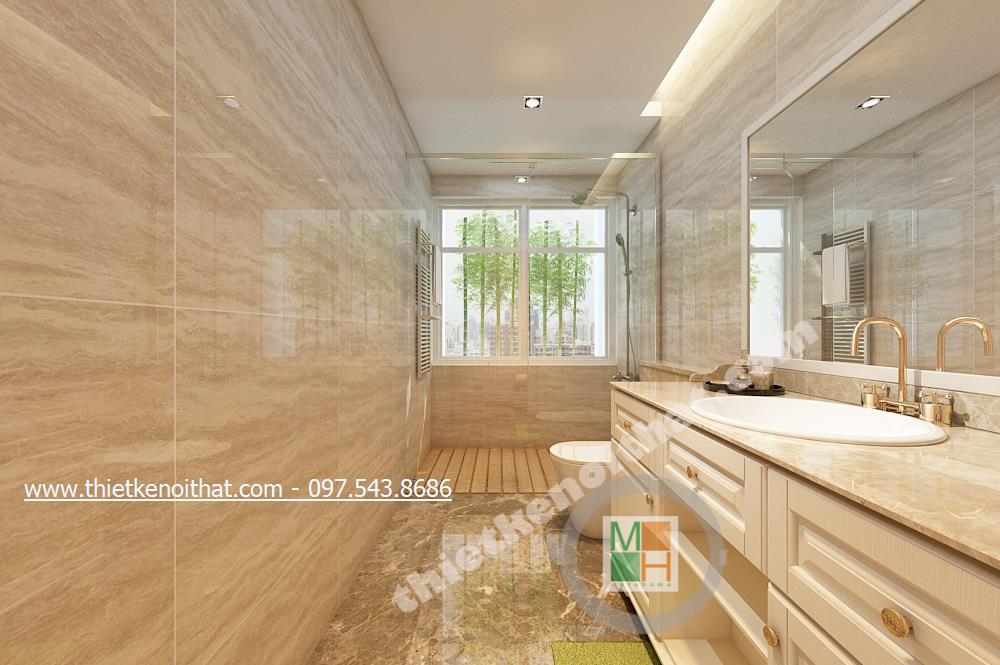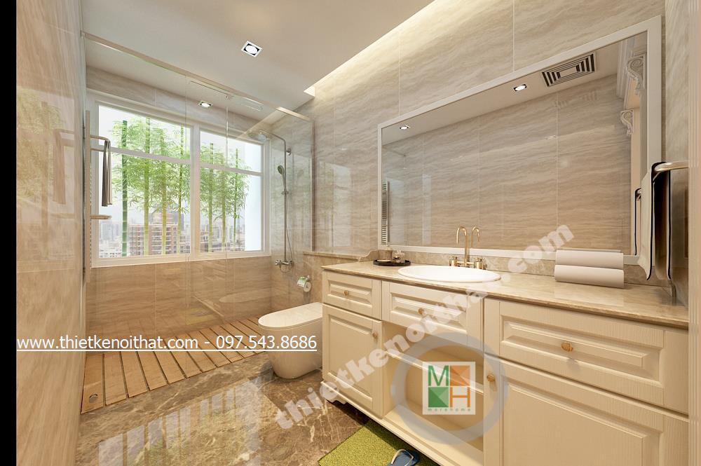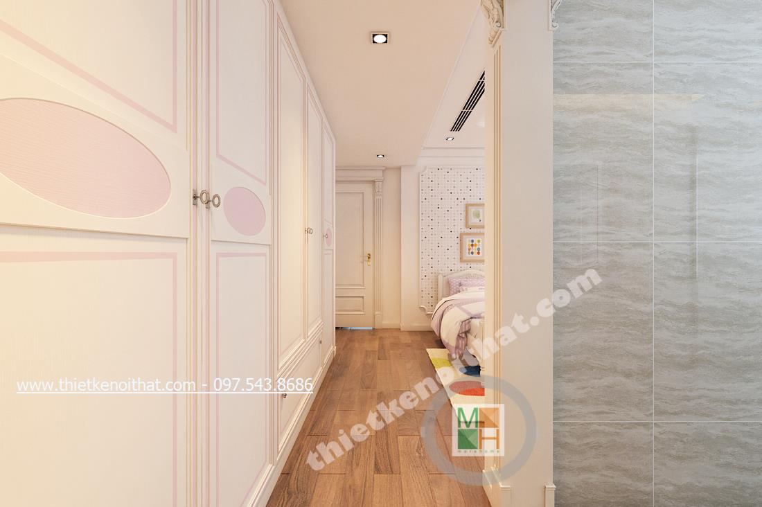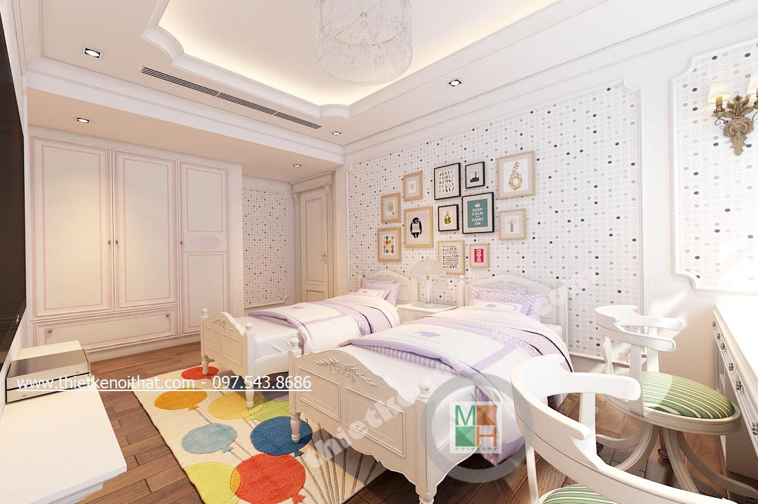 Thiết kế nội thất phòng ngủ Master của gia chủ lại lựa chọn tone màu sáng và gold nhẹ vừa có sự liên kết với thiết kế tân cổ điển chung của cả căn nhà mà vẫn tạo cảm giác nhẹ nhàng, thư thái. Ở đây chiếc thảm giả lông được lồng khéo léo dưới chân giường cầu kỳ giúp mang đến cảm giác đế vương. Các chi tiết khác như đèn giả quạt và gương trên đầu giường đều là sự kết hợp hài hòa và thanh lịch giữa thiết kế nội thất tân cổ điển và thiết kế nội thất phong cách hiện đại.