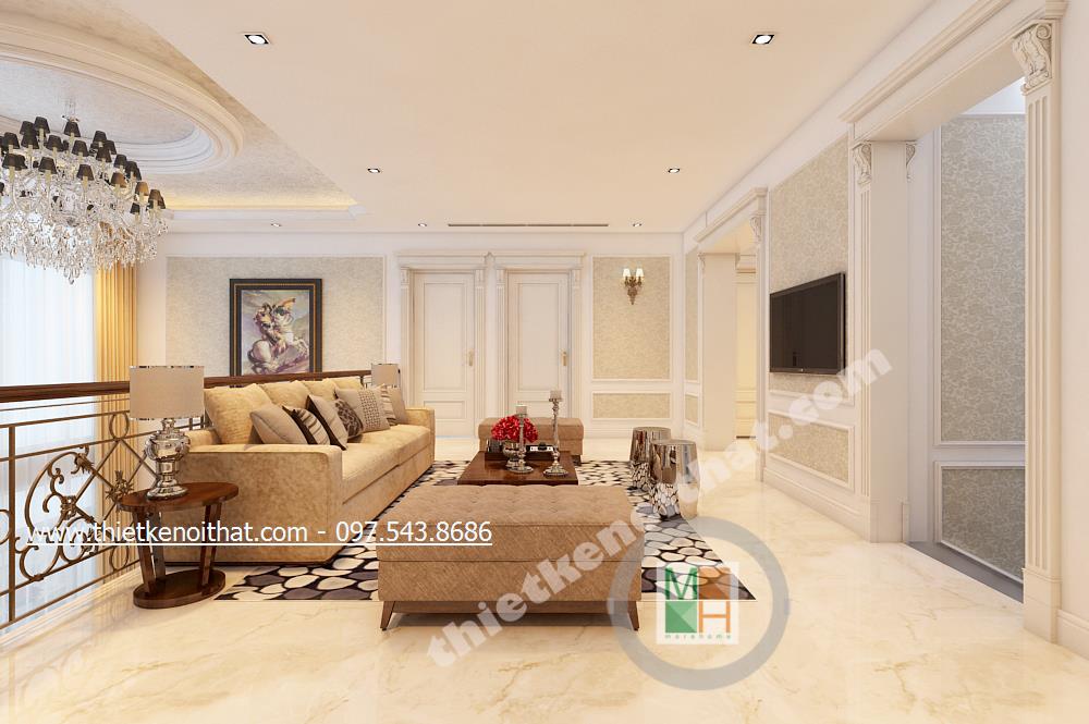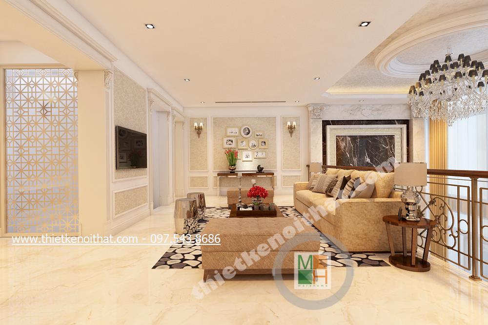 Bước lên tầng hai từ chiếc cầu thang đá cẩm thạch, ta như đi giữa không gian của một vương triều La Mã cổ đại để bước ra không gian rộng lớn của thảo nguyên xung quanh. Đến đây, giữa những căn phòng là bộ sofa tạo một căn phòng ảo nhỏ với liên tưởng như một gia phòng khách nhỏ vừa thuận tiện đón tiếp khách nếu cả khách của bố mẹ và bạn bè của con đến thăm nhà vừa là nơi quây quần gia đình xem bộ phim tối trước khi cả nhà về phòng ngủ. Ở đây mang nhiều nét mới của cuộc sống hiện đại với chi tiết thảm cách tân, chiếc ghế lạ…nhưng vẫn hài hòa tinh tế với chi tiết đèn đồng kiểu dáng và hình thức với chiếc đèn phòng khách chính.