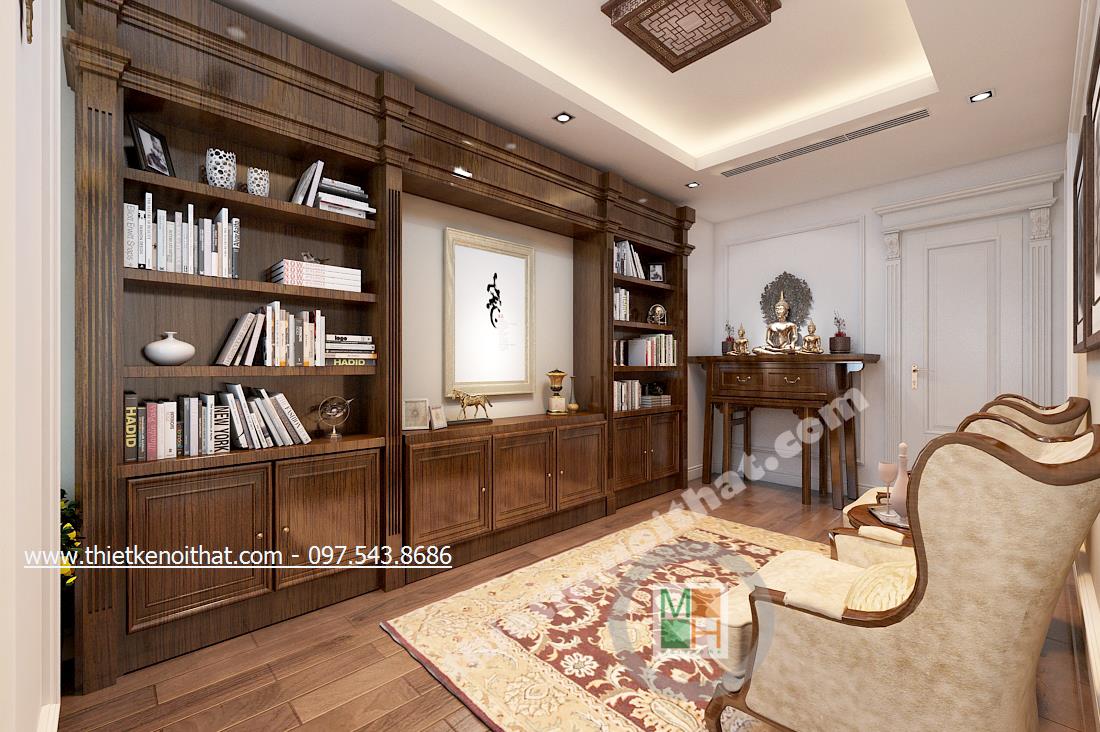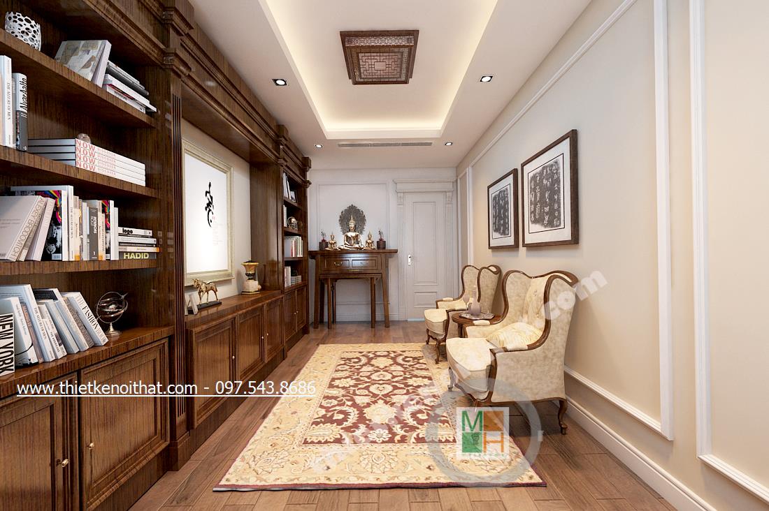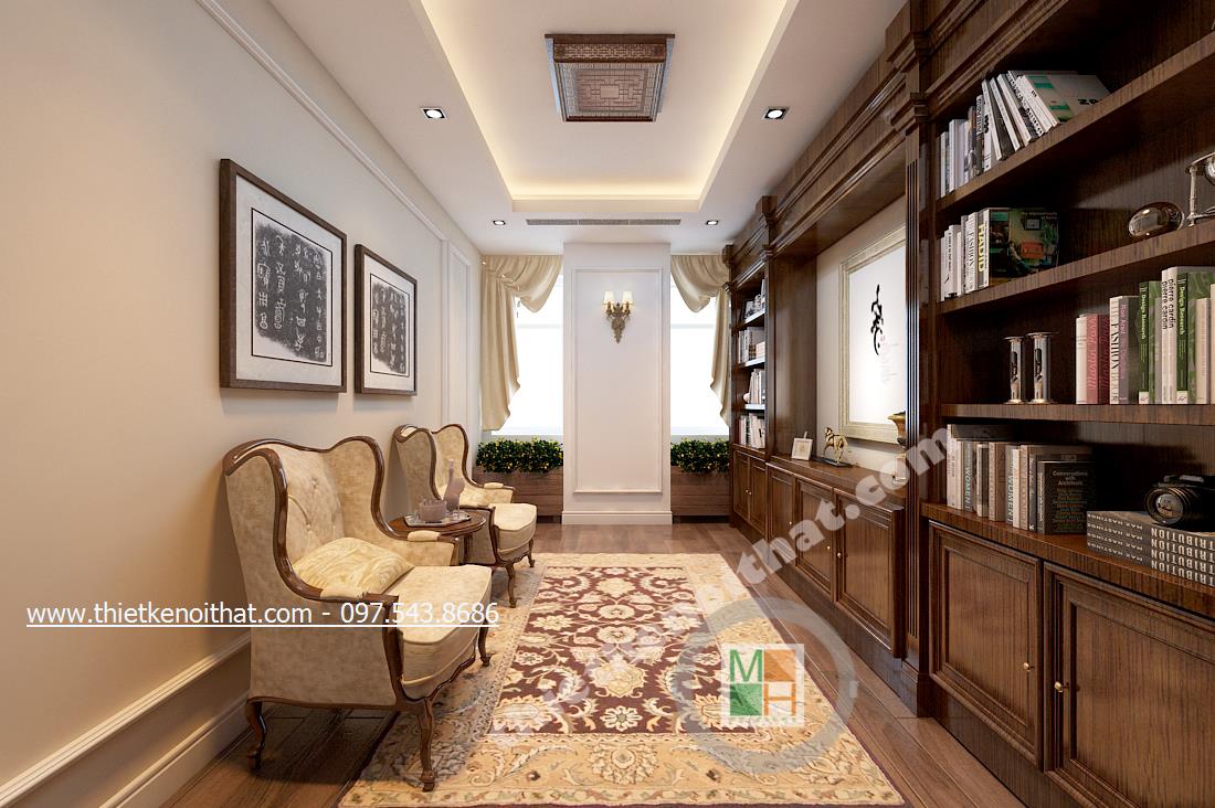 Phòng đọc sách nhỏ với chiếc tủ sách màu nâu trầm chạy dài theo chiều dài căn phòng gợi nhớ về các thư viện cổ Ai Cập xưa và tôn lên bề dày tri thức. Nét trầm theo tone màu nâu của căn phòng vô hình mà hữu ý gợi cảm giác bình yên vứt bỏ mọi muộn phiền của cuộc sống đời thường để bước vào thế giới tri thức. Đó còn là sự bình yên về với thiên nhiên với chi tiết cây trang trí ở gần bệ cửa sổ. Chiếc thảm trang trí cũng gợi về phong cách vương giả Á Đông rất cầu kỳ và quý phái.