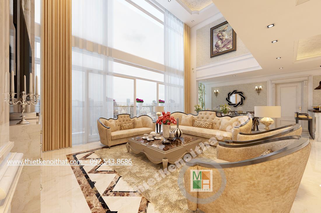 Phòng khách được đặt chính giữa căn nhà nhằm tập trung mọi sự chú ý và là trung tâm của cái đẹp. Phòng khách đặt ngay cạnh ban công và sử dụng tường kính giúp ánh sáng tự nhiên hòa vào căn nhà giúp căn nhà gần gũi với không gian sống bên ngoài hơn. Đặc biệt thiết kế rèm rủ từ tầng 2 xuống cũng giúp căn nhà trở nên cao hơn và nối liền không gian tạo cảm giác phòng khách thực sự rộng lớn. Điều nhấn mạnh giúp Duplex thực sự trở thành căn hộ chứ không đơn thuần chỉ là chung cư.