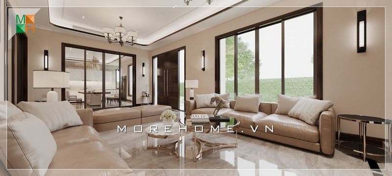 Mẫu thiết kế phòng khách sử dụng nội thất màu trung tính giúp không gian trở nên sang trọng, cao cấp, phù hợp chung cư, nhà phố, biệt thự phong cách hiện đại